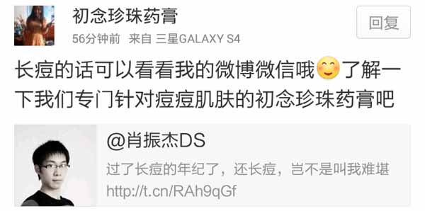 PS:發(fā)布了這條微博,大家可以看到,56分鐘的時候,收到一條評論,這妹子,可真的是很專業(yè)、而且很簡單的技巧,就給我推薦了一款去痘產品,當然這樣的營銷,效果怎么樣?據統計,轉化率都可以達80%左右。